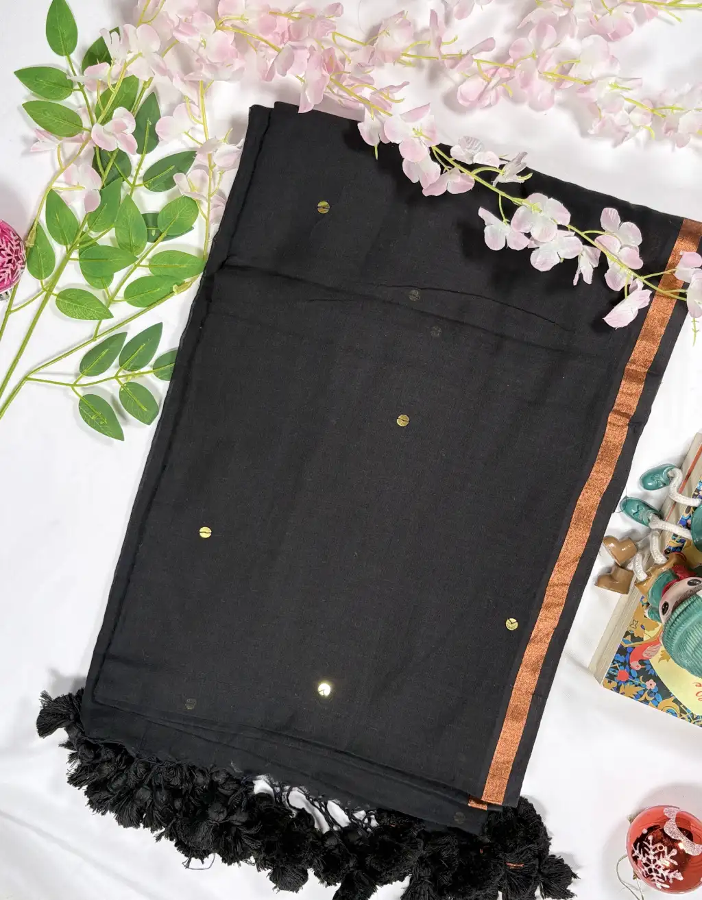 Drape yourself in effortless elegance with this stunning Black Mul Cotton Sitara Saree, adorned with delicate golden sitara (Mirror buti) work throughout. Crafted from ultra-soft, breathable mul cotton, this saree offers a feather-light drape and luxurious comfort—perfect for both everyday wear and special occasions. The subtle shimmer of sitara motifs paired with a refined contrast border adds a graceful festive touch without overpowering the look. Whether styled for office events, casual outings, or celebrations, this mul cotton beauty promises timeless sophistication.