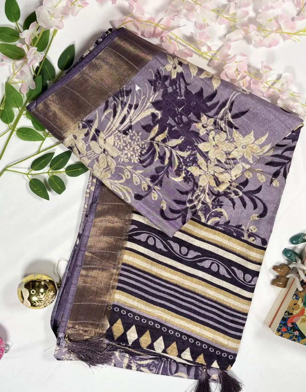 Introduce timeless elegance to your ethnic collection with this exquisite Purple Semi Matka Saree, featuring a perfect blend of soft texture, luxurious sheen, and artistic prints. The saree showcases a beautiful floral pattern combined with striped and geometric detailing, giving it a rich and contemporary appeal.