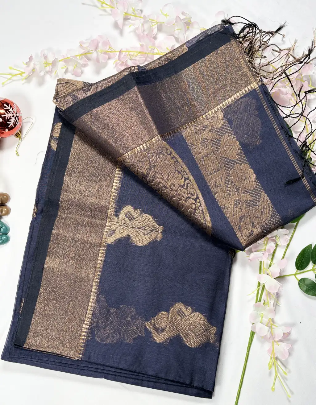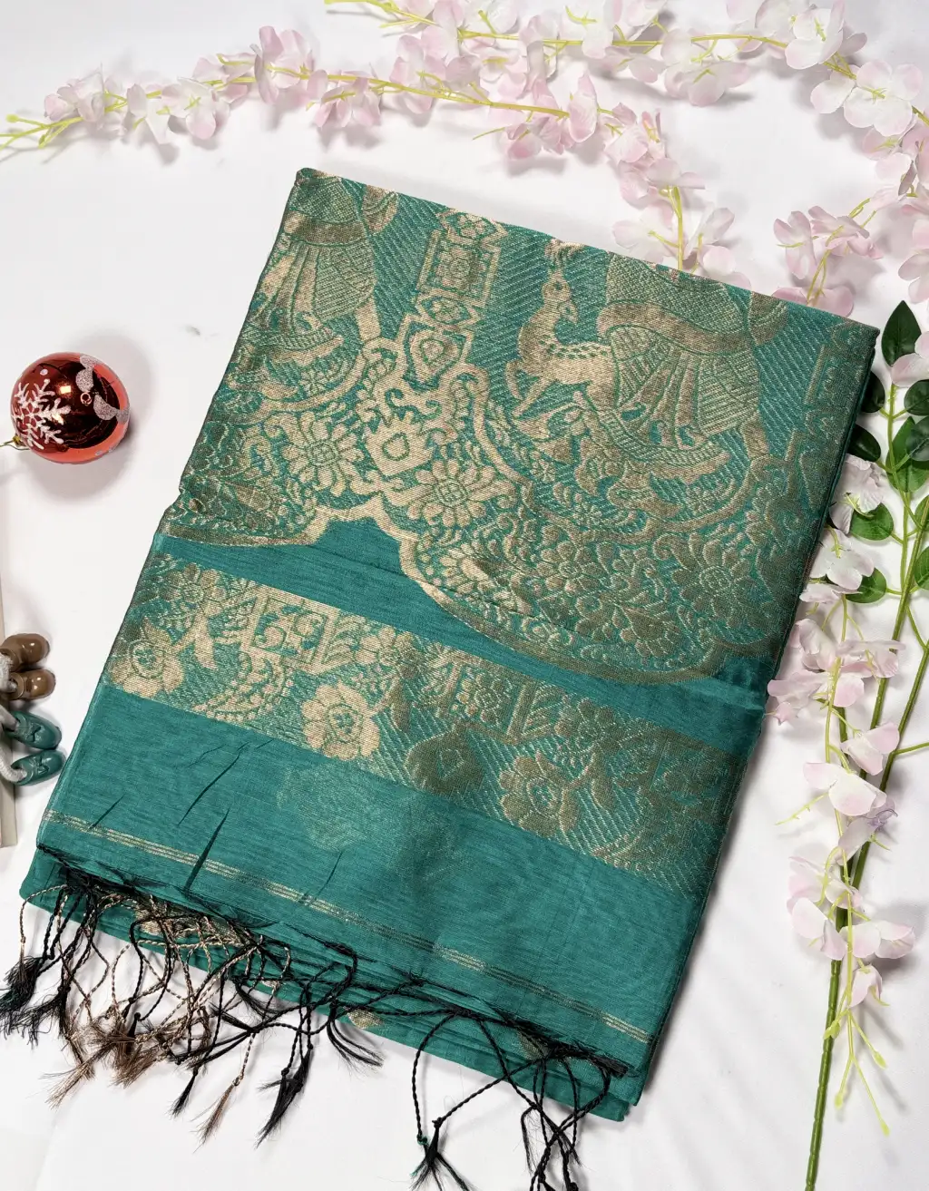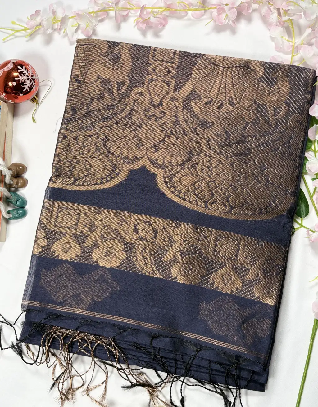 The finely woven border and detailed pallu enhance its regal charm, while the handloom craftsmanship ensures authenticity and uniqueness in every piece. Pair it with statement jewelry and a contrasting blouse to create an effortlessly elegant traditional look.