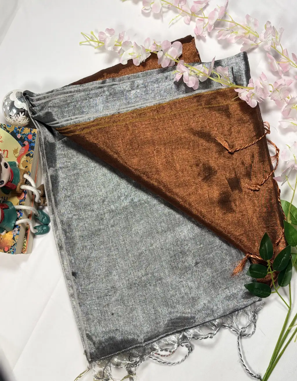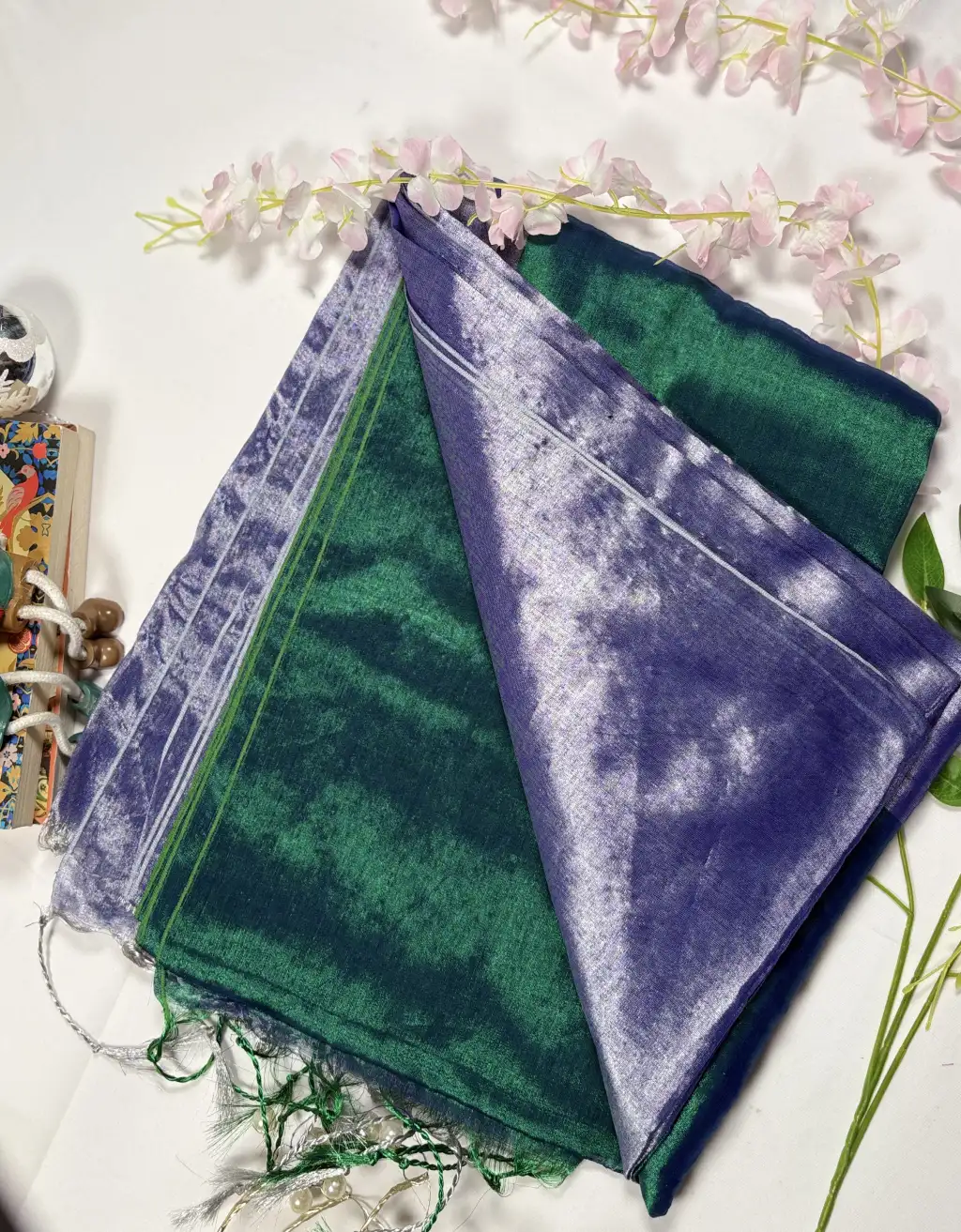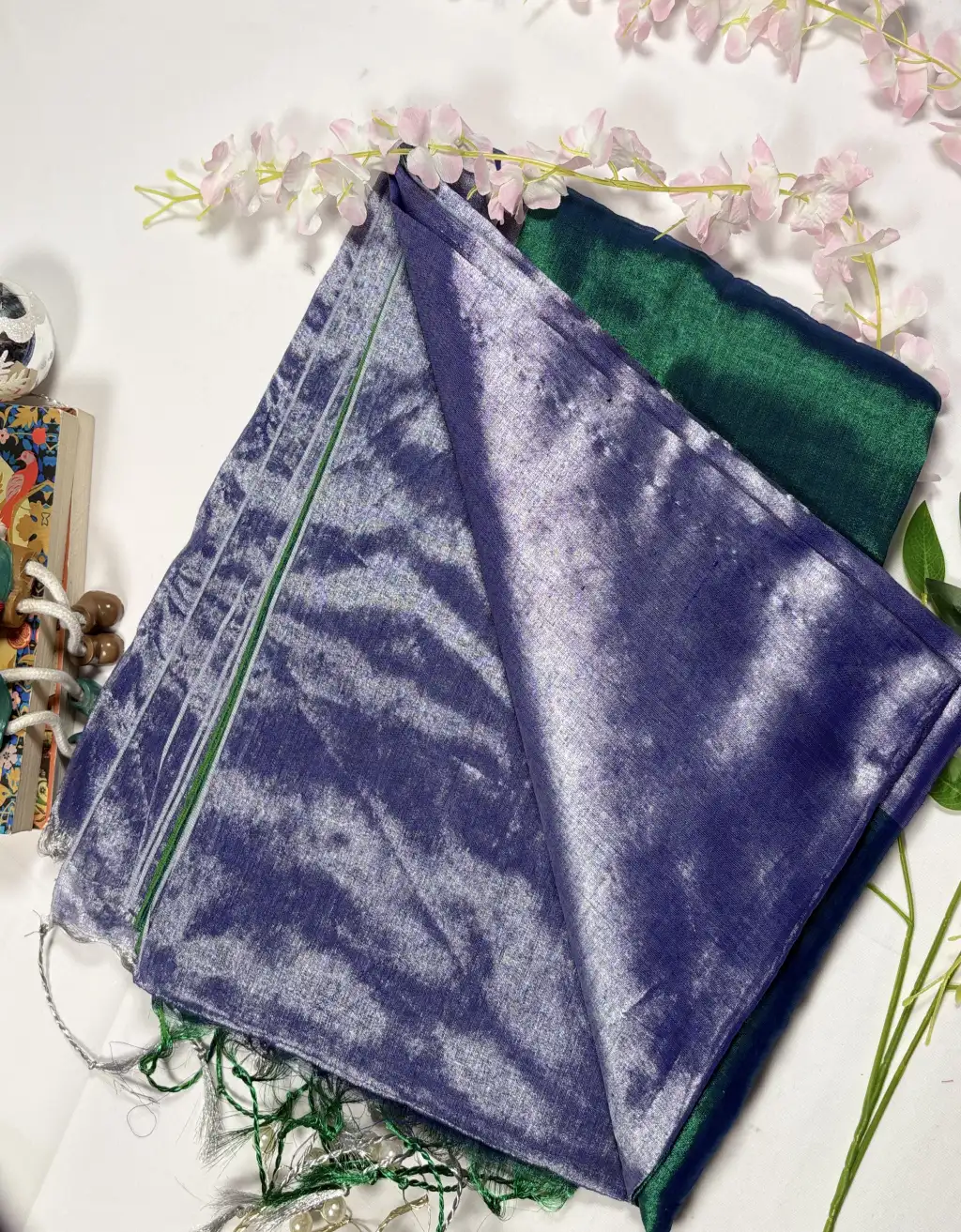 The natural sheen of tissue lends a subtle glow, while the fluid drape ensures comfort and elegance throughout the day. Delicate woven textures and tassel detailing at the pallu enhance its handcrafted charm. Ideal for festive gatherings, cultural events, evening functions, or minimal bridal trousseaus, this saree effortlessly bridges tradition and contemporary style.