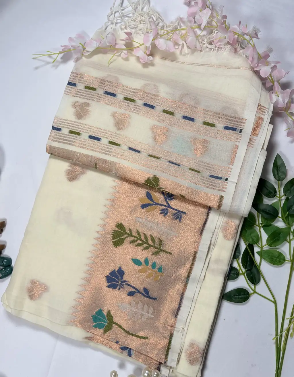 Experience timeless tradition with this exquisitely crafted Cotton Paithani Saree, designed for women who appreciate subtle elegance and heritage craftsmanship. The saree comes in a soft ivory tone that radiates calm sophistication, making it an ideal choice for both daytime and evening wear.