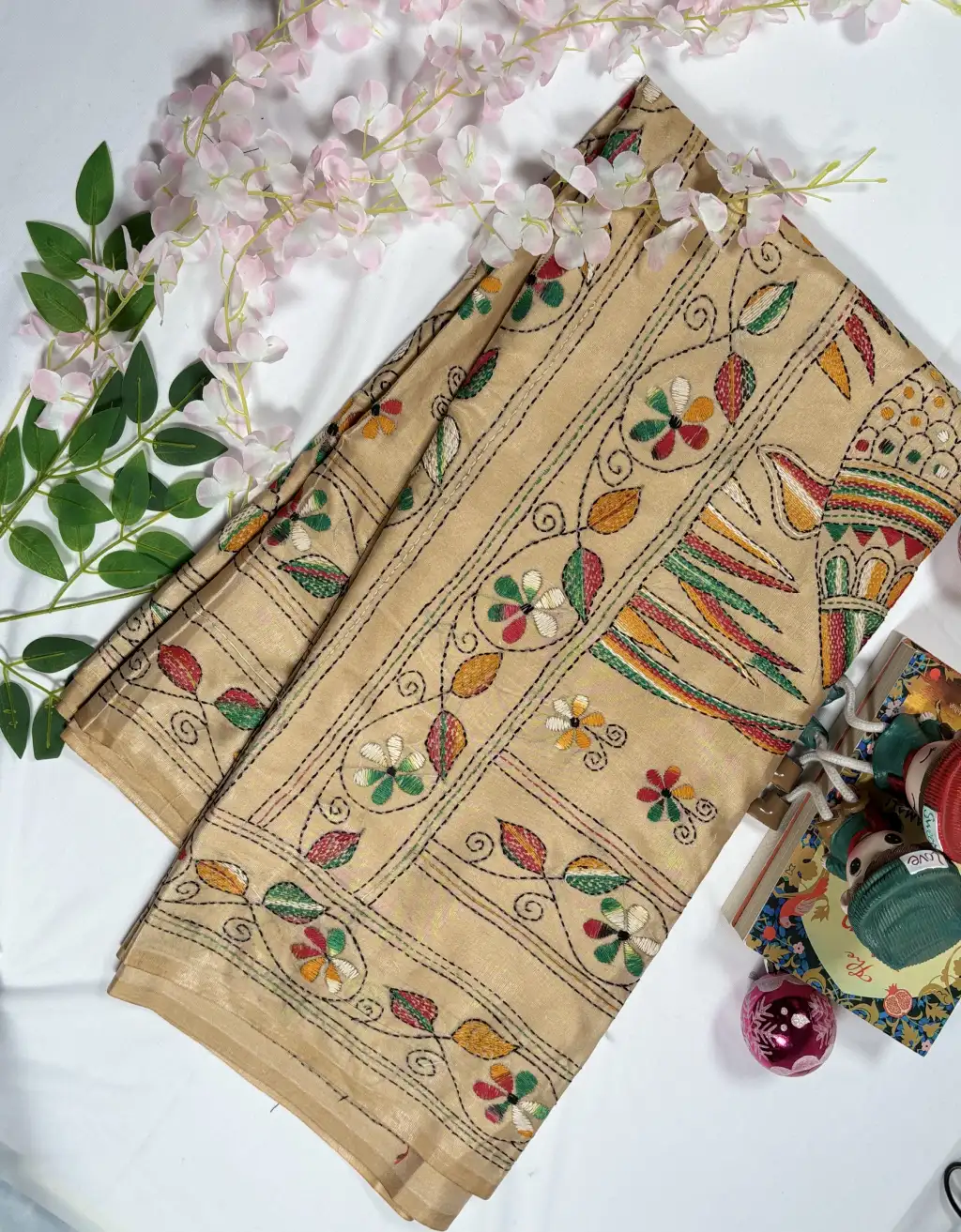 Crafted on a luxurious beige silk-blend fabric, this saree offers a fine drape, smooth texture, and lightweight comfort. The thoughtful combination of earthy tones and vibrant handcrafted patterns makes it an enchanting piece suitable for festive occasions, weddings, family gatherings, and cultural events.