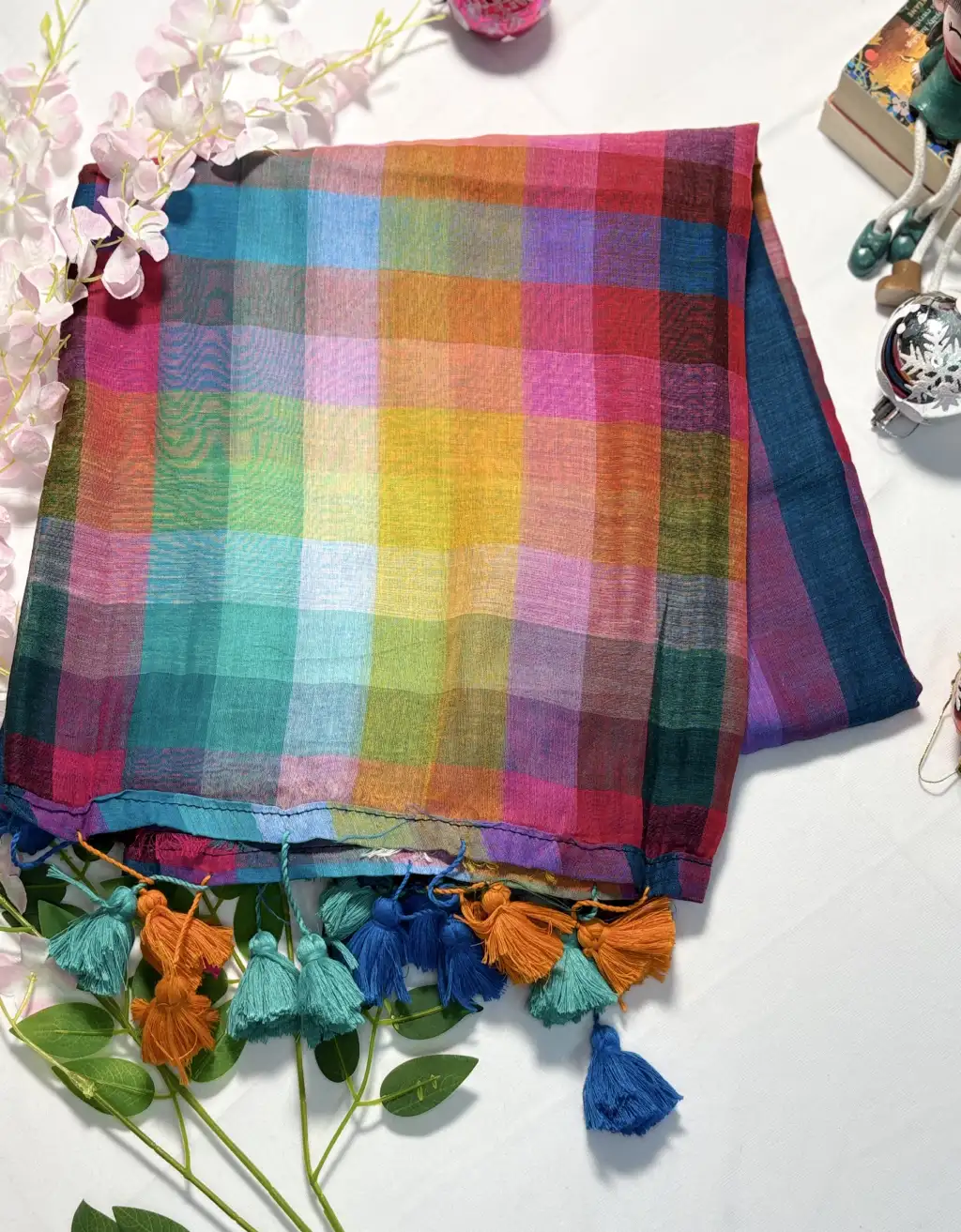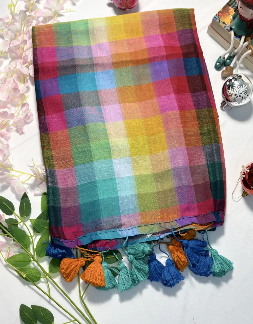 Featuring a beautiful spread of rainbow-inspired checks and finished with colorful handmade tassels, this saree adds a playful yet elegant charm to your wardrobe. Its soft drape and skin-friendly feel make it a go-to option for women of all age groups.