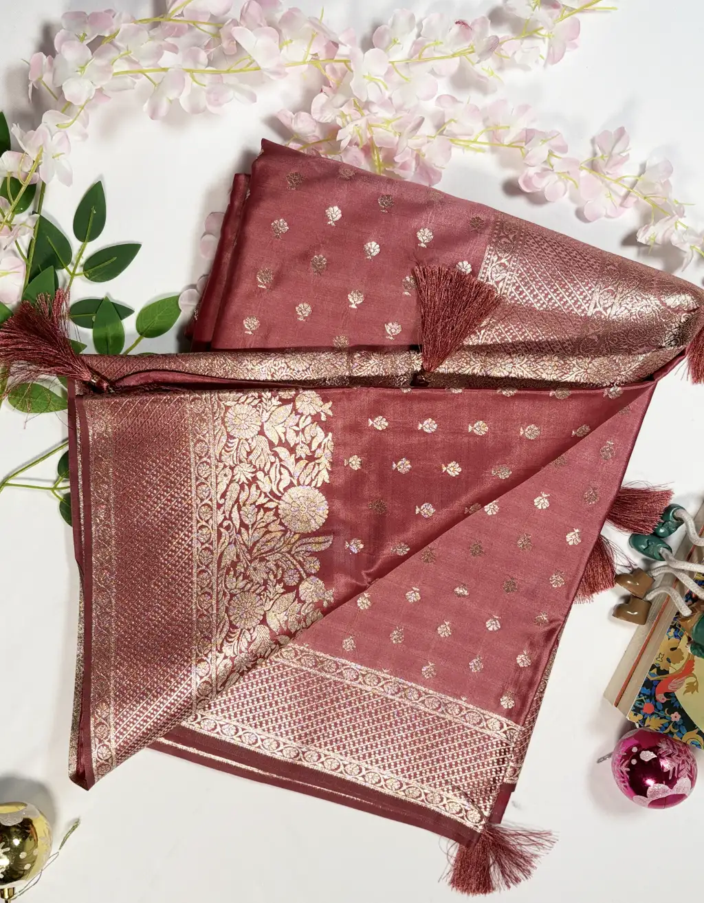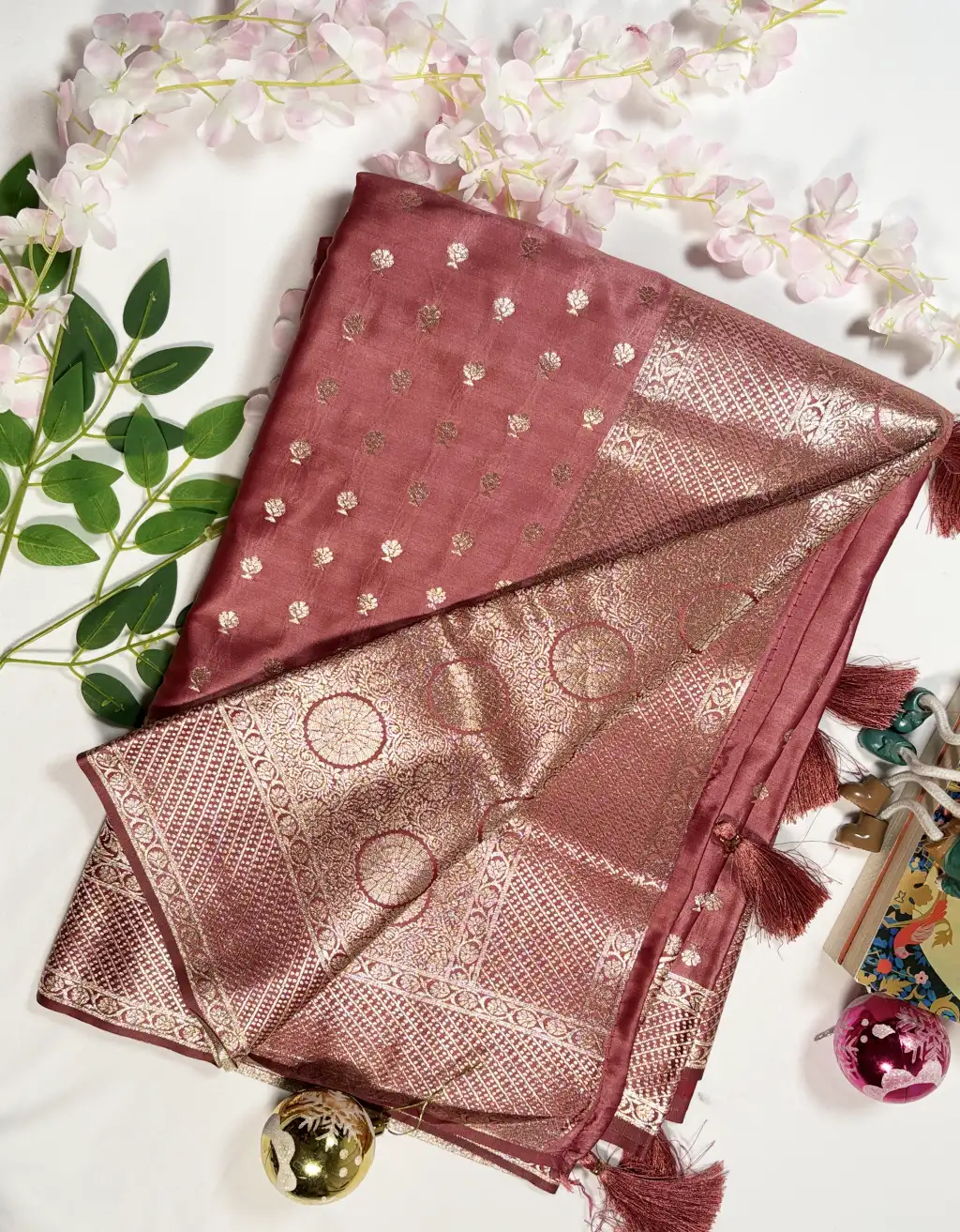 Experience timeless elegance with our Premium Semi Katan Silk Saree, crafted to offer a perfect blend of sheen, comfort, and luxury. The saree showcases beautifully woven zari buti motifs across the body, complemented by an intricately designed golden/silver zari pallu and classic tasseled edges.